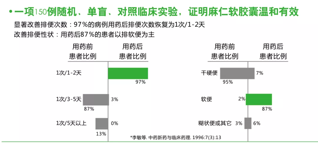 根据一项150例随机、单盲、对照临床实验,97%的病例用药后排便次数恢复为1次/1-2天,符合正常的排便规律;用药后87%的患者以排软便(正常的便便)为主,排便不再困难,也不会出现严重下泄。